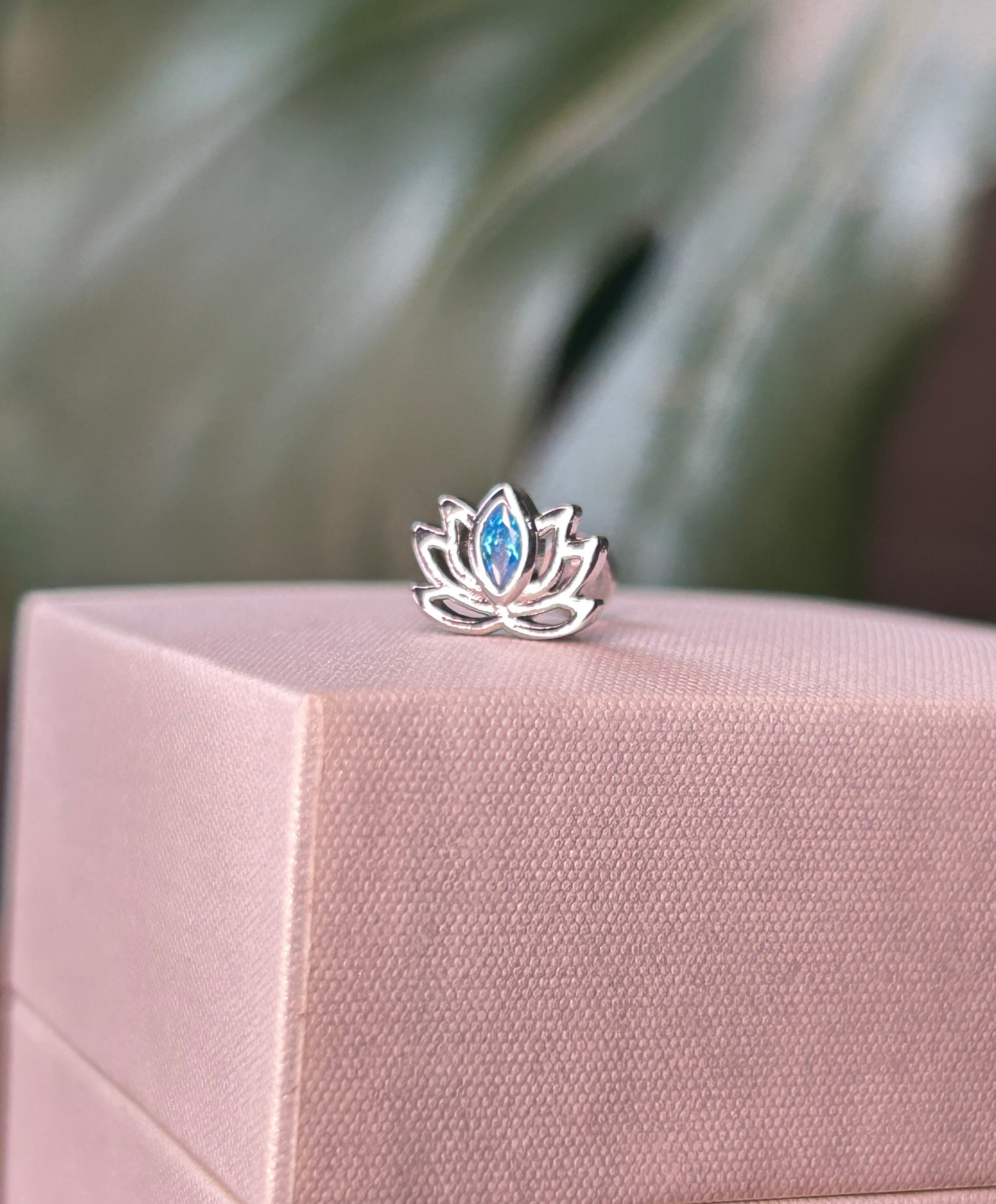 Caravana mini estilo solitario. Diseño flor de loto con mini strass color celeste. Fabricado en acero inoxidable