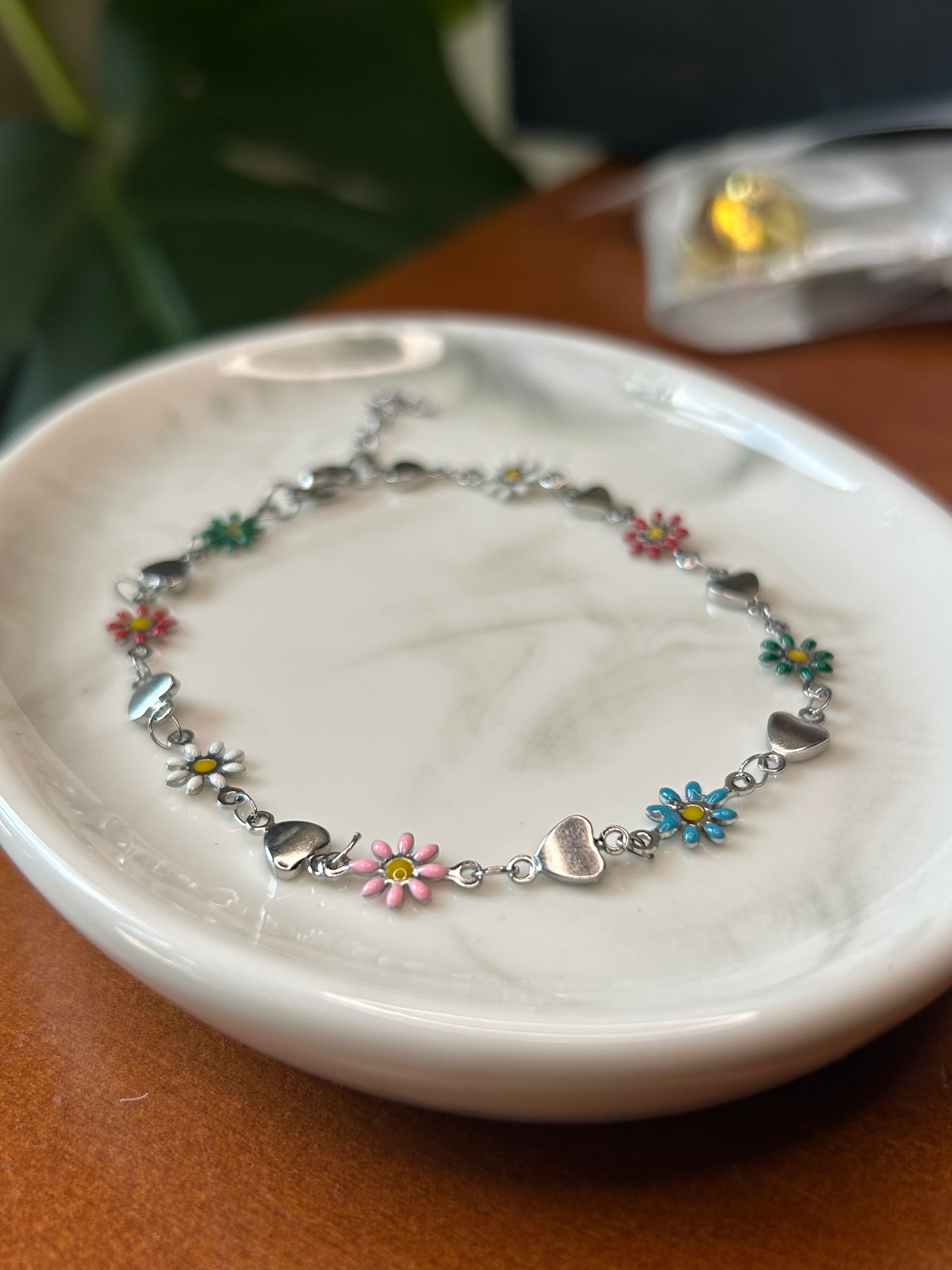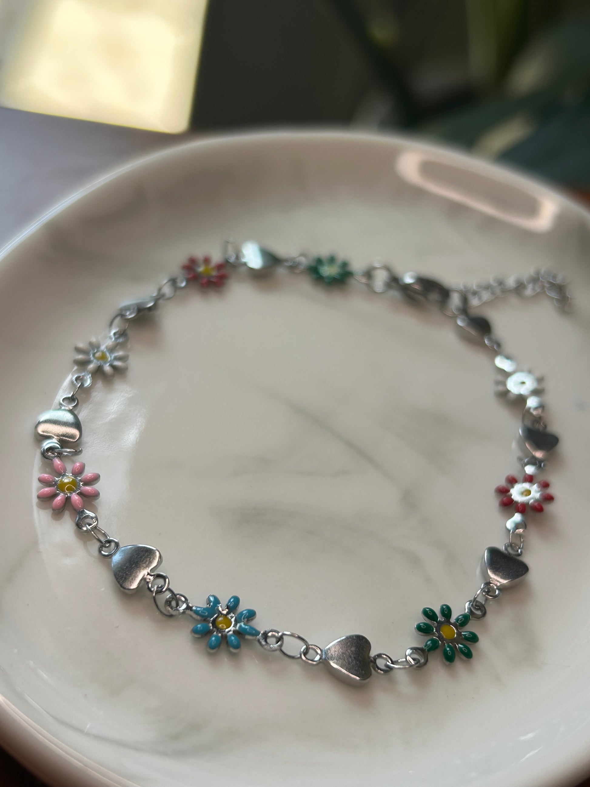 Tobillera en acero inoxidable con detalles de corazones y flores en resina